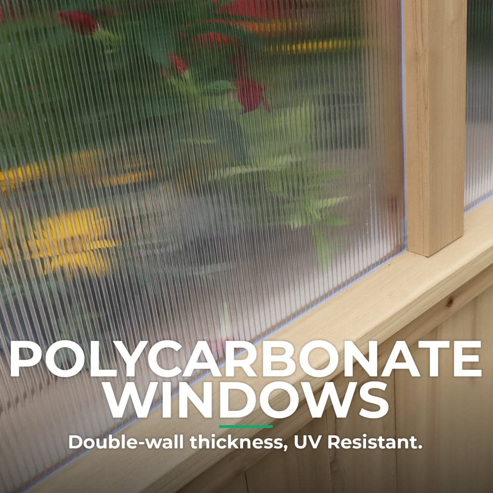 The 6.7 ft. x 6 ft. Meridian Greenhouse is the ideal choice for gardening enthusiasts and is the perfect addition to your outdoor space. Great for year-round growing with a Garden Tower and provides room for pots of perennial herbs like lavender to make the space calm and relaxing. Shipping Included!Its 6-foot-high side walls make it comfortable for standing and help ensure proper airflow. The 32-inch-high cedar base walls are built with sturdy tongue-and-groove construction. The double-wall polycarbonate windows are strong and durable, while an automatic roof vent opener and louvered base wall vent maintain optimal temperature and humidity levels.Built with premium cedar lumber, you can feel good knowing the quality of Meridian Greenhouse can withstand the outdoor elements. All cedar pieces come pre-stained with an attractive, natural cedar stain. The cedar door features a latch and closer with a quick-hold feature that keeps the door open when desired.All sections are pre-cut and pre-drilled for easier assembly. The Greenhouse comes with simple to follow illustrated instructions and we’ve created a helpful hints video to make your installation process easier, as well. Yardistry stands by the quality of its products, and 6.7 ft. x 6 ft. Meridian Greenhouse comes with a five-year limited warranty.
