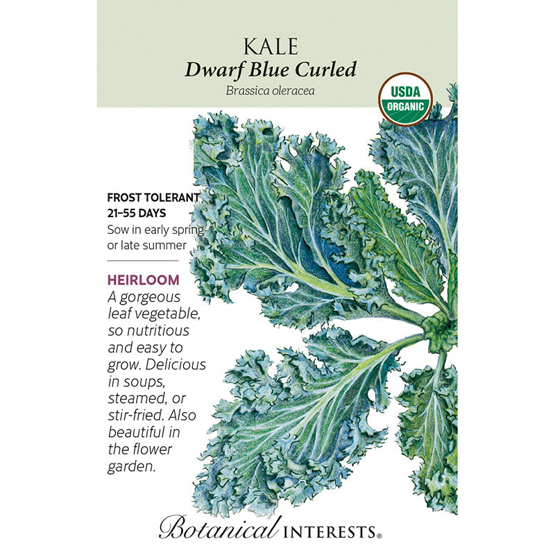 Dwarf Blue Curled', from the 1800s, is extremely hardy and will overwinter in all but the coldest climates. Like most greens, it grows best in cool weather but will also withstand some heat. Leaves are rich in vitamins and minerals and low in calories. The flavor of the leaves is sweetened after a light frost; delicious in winter soups!/p>Days to Maturity: 55 daysFamily: BrassicaceaeNative: EuropeHardiness: Biennial grown as an annual, kale is very cold hardy and may overwinter in milder climates.Exposure: Full sunPlant Dimensions: 12"–30" tall and wideVariety Info: Bluish-green leaves with curly, frilly edges off a central stem.Attributes: Heat Tolerant, Frost Tolerant