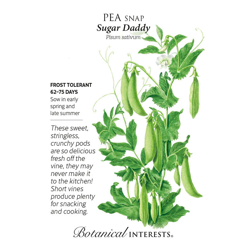 Sugar Daddy' peas were bred by Dr. Calvin Lamborn, the innovative research director that developed the first edible-podded snap pea, 'Sugar Snap'. However, 'Sugar Daddy' has some big improvementsâstringless pods, shorter vines, and improved disease resistance. Slender, 3" pods have a deep green color adding to their appeal. The short plants reach only 24"-30" tall and don't need support; a short fence or trellis will make it easier to find and harvest the crunchy peas, though. Pods can be served fresh by themselves or with dip, or added to give crunch to salads. Add to stir-fries and soups or steam for a delicious vegetable. Resistant to powdery mildew and tolerant to bean leaf roll virus.Days to Maturity: 62â75 daysFamily: FabaceaeType: Snap Pea Hardiness: Frost-tolerant annualExposure: Full sunPlant Dimensions: 24"â30" vinesAttributes: Powdery Mildew Resistant, Bean Leaf Roll Virus Resistant, Frost Tolerant